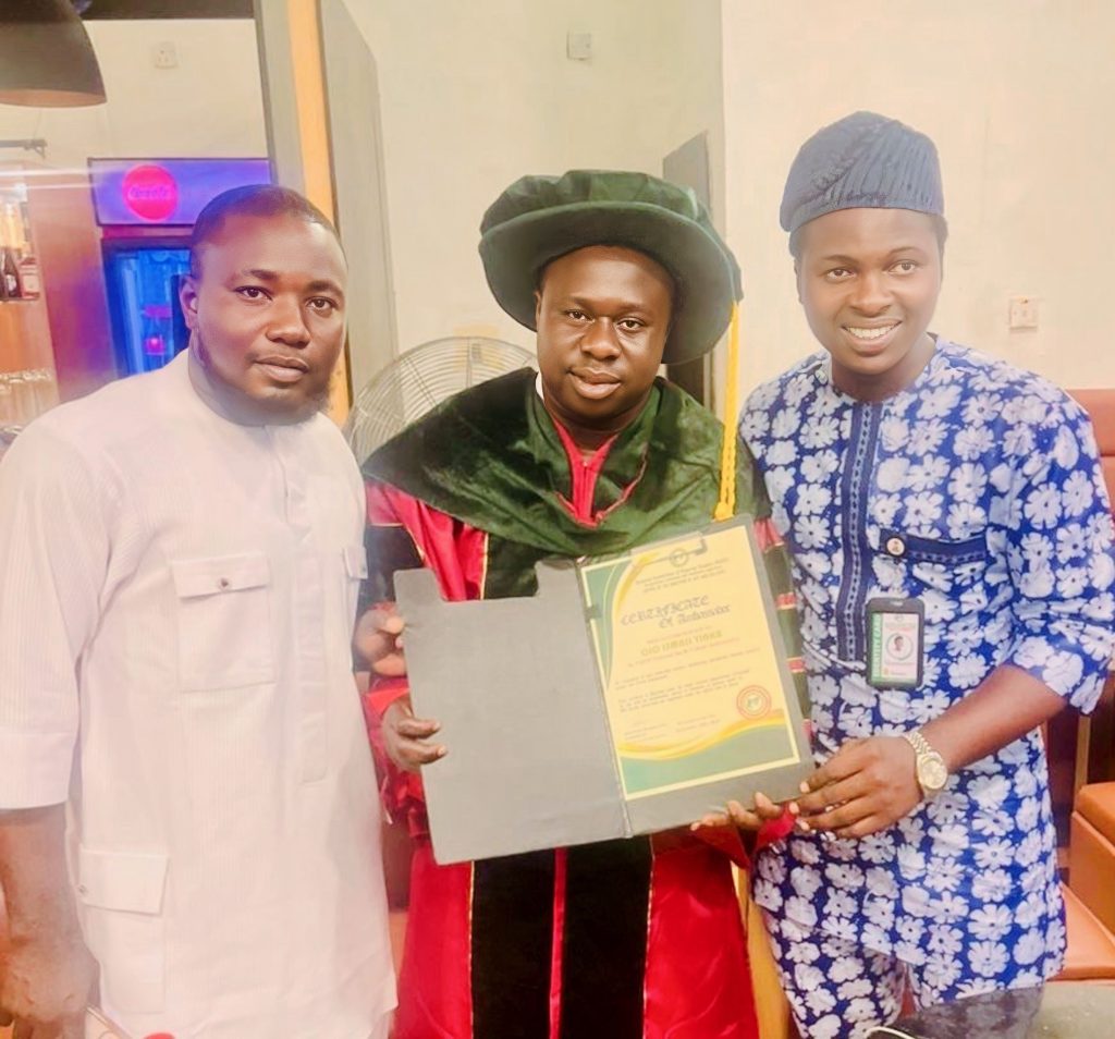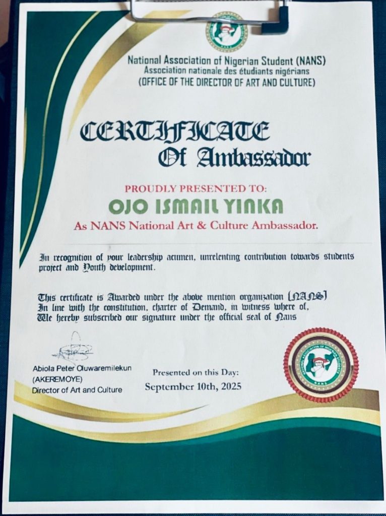 The National Association of Nigerian Students (NANS) has conferred a National Honour of Art & Culture Ambassador on the Chief Executive Officer of Alfanla Entertainment Record Label, Mr. Ojo Ismail Yinka, popularly known as Alfanla, in recognition of his exceptional contributions to youth development and the promotion of creative talent across Nigeria.