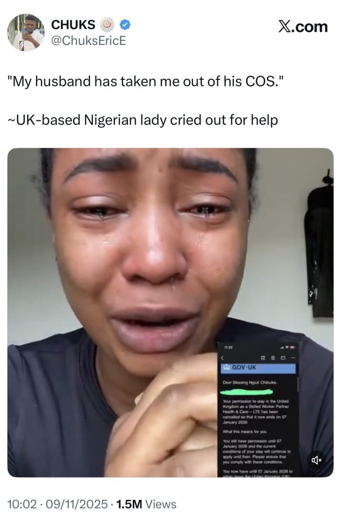 A UK-based Nigerian woman has issued a public plea for help after her husband allegedly revoked her Certificate of Sponsorship (COS), leaving her with only 60 days to secure new sponsorship or face deportation from the United Kingdom.